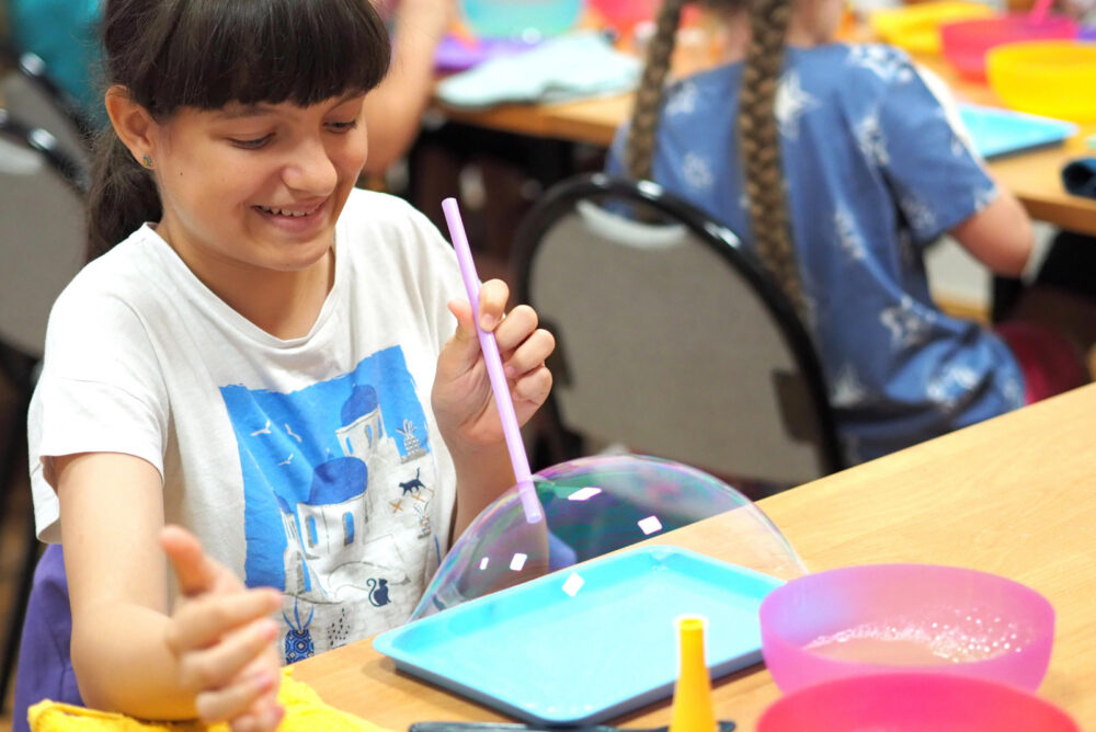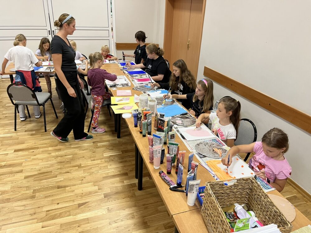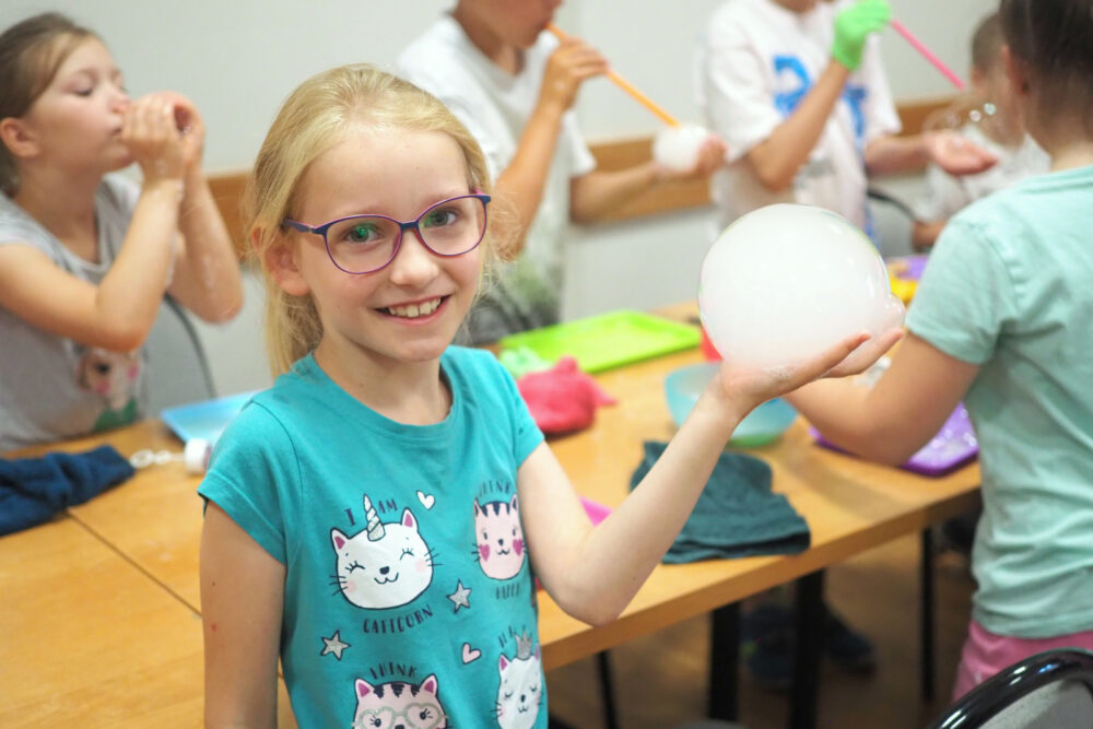 Na miejscu w Domu Kultury też było super! Zorganizowaliśmy wiele warsztatów, w których dzieci chętnie brały udział! Zrobiliśmy piękne lampiony ze słoików, upiekliśmy ciasto z jagodami i nauczyliśmy się robić ogrooomne bańki!