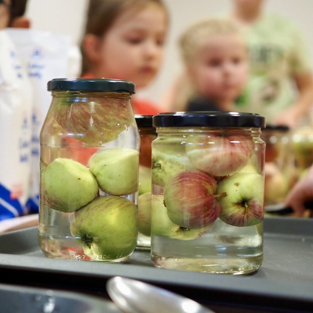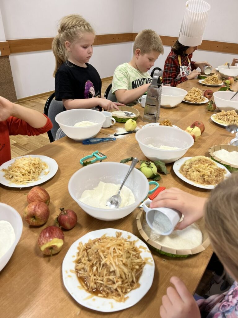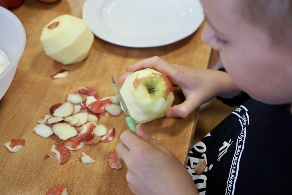 Pod czujnym okiem prowadzących dzieci samodzielnie obierały jabłka, tarły, odmierzały, sypały, mieszały. Nie zabrakło przy tym dobrej zabawy!