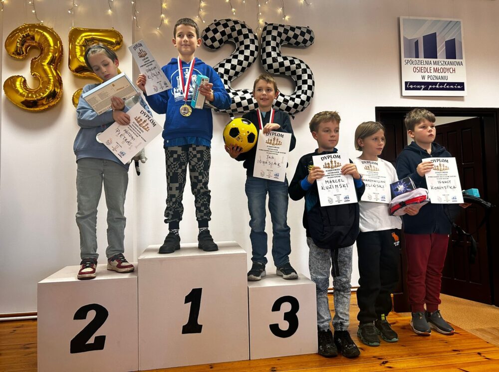 W dniach 18-19.10.2025 odbył się Festiwal Szachowy z okazji 25-lecia klubu szachowego UMKS „Na Pięterku” Poznań i 35-lecia działalności DK „Na Pięterku. Pierwszego dnia obchodów jubileuszy odbył się turniej dla juniorów z rocznika 2013 i młodszych do rankingu 1600. Wystartowało ich aż 56. Po siedmiu zaciętych rundach wyłoniono zwycięzców. Najlepszym chłopcem okazał się Stanisław Kukla z KSz LECH-WSUS Poznań, a w kategorii damskiej najwyżej na podium stanęła reprezentantka UMKS „Na Pięterku Poznań” Lena Babiak. Wręczono nagrody główne oddzielnie w kategorii dziewcząt i chłopców (nagrodzono po pierwszych 6 miejsc). Wśród uczestników rozlosowano także 10 dodatkowych jubileuszowych niespodzianek, a każdy zawodnik wyszedł z pamiątkowym dyplomem i medalem na szyi.