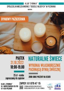 Jesień w pełni i już za chwilę zaczynamy serię warsztatów w ramach DYNIOWEGO PAŹDZIERNIKA Zapraszamy 28 października o godzinie 18:00 na rodzinne warsztaty ZIOŁOWE BŁYSZCZYKI DO UST - jesienna pielęgnacja, ziołowe, naturalne receptury, spotkanie w kobiecym gronie. koszt: 20 zł osoba Zapisy codziennie od pon. do pt. w godz. 16.00-20.00 pod nr tel. 61 879 47 15 oraz 695 151 856 Otulmy się ciepłem relacji przy wspólnym działaniu na jesień. Do zobaczenia w Cybince