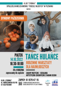 Jesień w pełni i już za chwilę zaczynamy serię warsztatów w ramach DYNIOWEGO PAŹDZIERNIKA Zapraszamy 14 października o godzinie 16.30 na rodzinne warsztaty TAŃCE I HULAŃCE - będzie to spotkanie pełne zabaw muzycznych i działania artystyczno-sensorycznego z darami jesieni. Zapraszamy Rodziców, Dziadków z Najmłodszymi koszt:20 zł Rodzina Zapisy codziennie od pon. do pt. w godz. 16.00-20.00 pod nr tel. 61 879 47 15 oraz 695 151 856 Otulmy się ciepłem relacji przy wspólnym działaniu na jesień. Do zobaczenia w Cybince