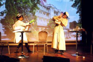 Podobno każdy potrzebuje terapii, tylko nie każdy o tym wie. Spektakl pt. „Upiór w sanatorium, czyli nic na serio jest pretekstem do spotkania z Widzem w garderobie teatralnej. Lawirując zręcznie między światem realu a fikcją fabularną, aktorki zacierają granice teatru pudełkowego, zaskakując widza przenikaniem się teatralnych przestrzeni. „Twórczynie spektaklu wychodzą naprzeciw zapotrzebowaniu szeroko pojętej widowni na chwilę oddechu i radości, tak cennych, szczególnie w dzisiejszych, niełatwych czasach. Koncentrują swe działania artystyczne wokół dobroczynnych walorów terapii poprzez śmiech, który jest wszak…