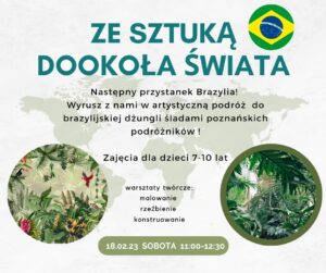 Pracownia Aktywator sztuki zaprasza na kolejne spotkanie z cyklu Ze Sztuką Dookoła Świata. Tym razem odwiedzimy Brazylię 🙂 Warsztaty plastyczne przeznaczone dla dzieci w wieku 7-10 lat, rodzice mile widziani:) Warsztaty poprowadzi Weronika Goszczyńska. Informacje i zapisy: 603 999 502