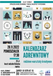Kalendarze adwentowe - warsztaty plastyczne dla Dzieci i Rodzin (koszt 25 zł dziecko), godz. 17.30 Zapisy i informacja codziennie od pon. do pt. w godz. 16.00-20.00 pod nr tel. 61 879 47 15,