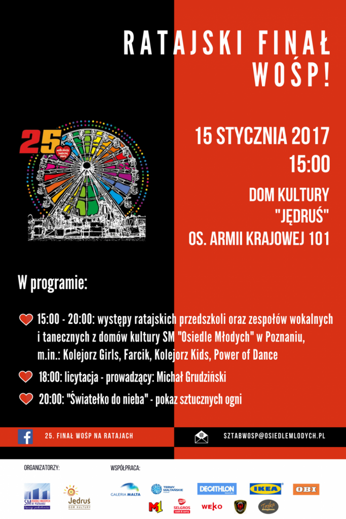 Do 25. Finału WOŚP pozostało już kilka dni. Program ratajskiego Koncertu bogaty jest w szereg atrakcji, czekają nas występy teatralne, wokalne oraz taneczne, a wszystko odbędzie się w Domu Kultury „Jędruś” 15 stycznia. Startujemy punktualnie o 15:00.