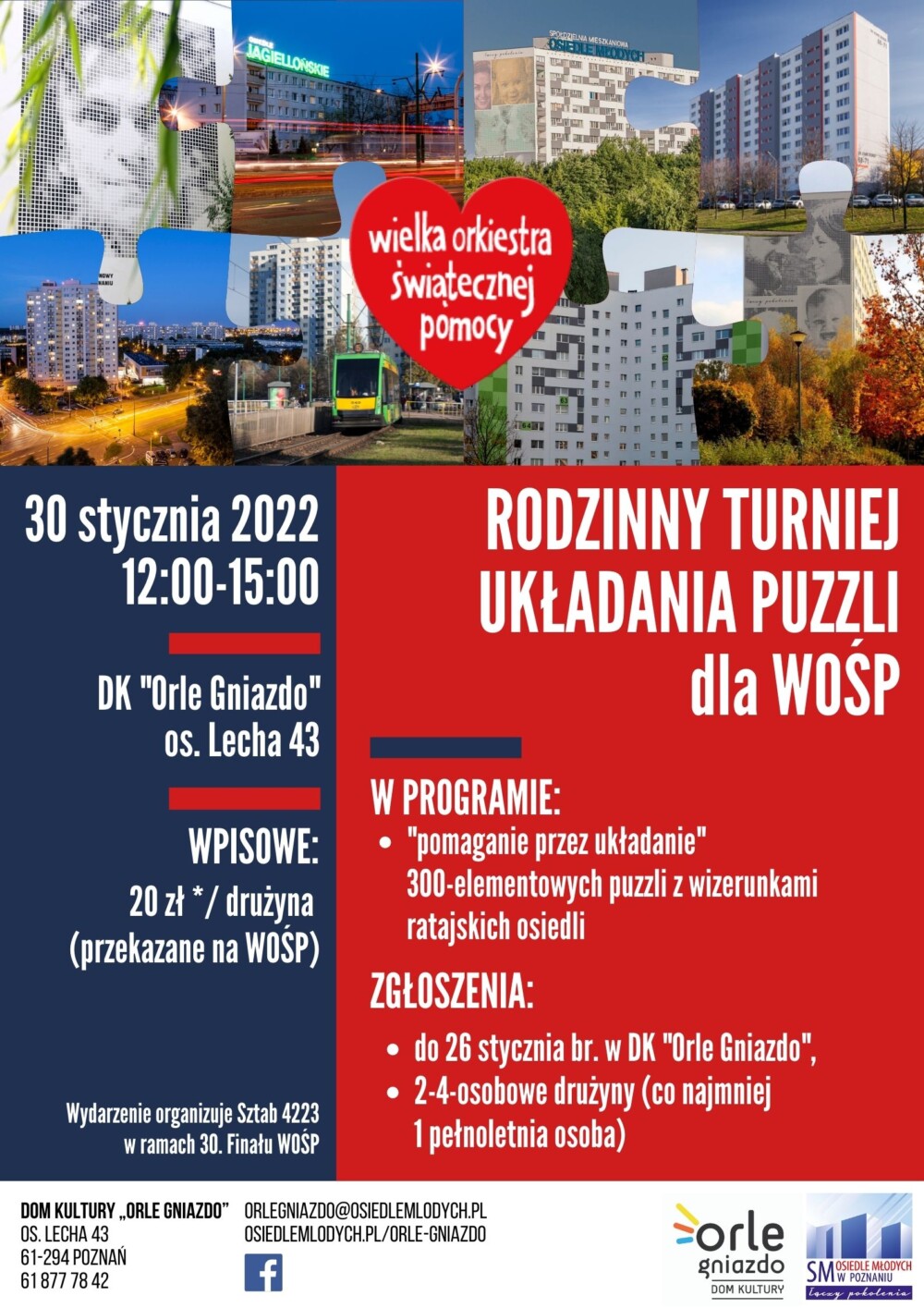 Przy okazji niezwykłej imprezy, czyli 30. Finału Wielkiej Orkiestry Świątecznej Pomocy, który w tym roku koncentruje się na zapewnieniu najwyższych standardów diagnostyki i leczenia wzroku dzieci, chcielibyśmy zaprosić Was do włączenia się do akcji, poprzez udział w Rodzinnym Turnieju Układania Puzzli. Z pewnością znajdą się wśród Waszych wspaniałych Rodzin miłośnicy układanek i to właśnie dla nich organizujemy konkurs!